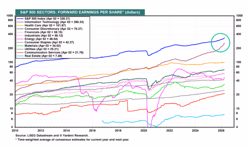 The Iran war has also presented headwinds to tech stocks (along with the overall market). Beyond being a risk-off event, the conflict has of course led to much higher oil prices. This, in turn, has fed through to higher bond yields: The 10-year U.S. government yield, which touched around 3.95% in late February, surged 30 basis points (BPS) by March 13 alongside rising oil prices. Higher long-term yields tend to weigh on tech stocks given that much of their valuations rest on expected earnings many years out.